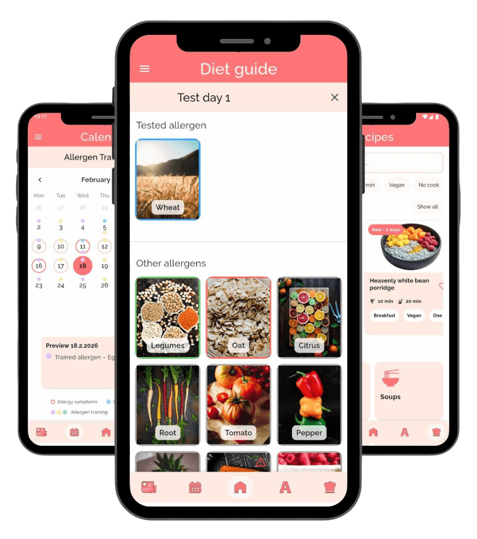 Elimination phase, guided allergen testing, symptom calendar, recipes and clear results — step by step.